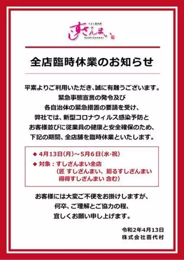 株式会社喜代村(東京都中央区、木村清社長)は4月13日から5月6日まで、同社が運営する「すしざんまい」全店を臨時休業している。緊急事態宣言の発令及び各自治体の緊急措置の要請があったことを受け、新型コロナウイルス感染予防と、利用客・従業員の健康と安全確保のため休業を決定。