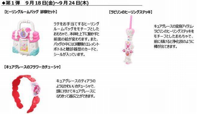 9月18日から9月24日までの第1弾は「ヒーリングルームバッグ 診察セット」「ラビリンのヒーリングステッキ」「キュアグレースのフラワーカチューシャ」、9月25日から10月1日までの第2弾は「ハートスピン ヒーリングステッキ」「耳がパタパタ ラテ」「マクドナルドオリジナル エレメントボトル キーリング」。10月2日以降の第3弾は、第1弾・第2弾計6種類の中から1アイテムが付く。