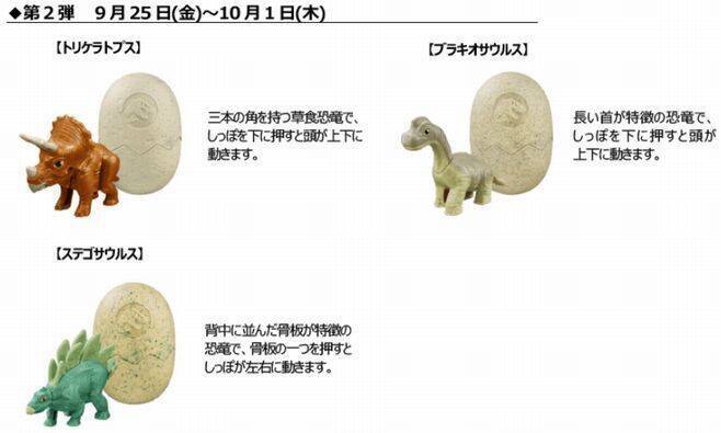 9月18日から24日までの第1弾では「ティラノサウルス」「プテラノドン」「アンキロサウルス(バンピー)」の3種類、9月25日から10月1日までの第2弾では「トリケラトプス」「ブラキオサウルス」「ステゴサウルス」の3種類、10月2日以降の第3弾では第1弾・第2弾計6種類の中から1体が付く。