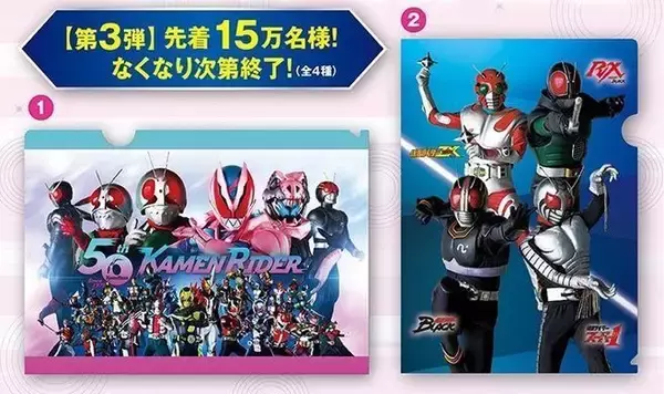 9月3日から展開している、特撮ドラマ「仮面ライダーシリーズ」とのコラボによる「仮面ライダーキャンペーン」の一環で実施する店頭プレゼント。クリアファイル第1弾は9月3日から、第2弾は9月17日から配布を実施した。
