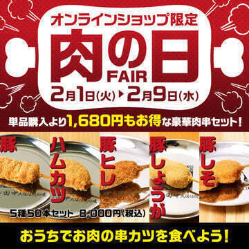 串カツ専門店「串カツ田中」は2月9日までの期間、オンラインショップ限定で“肉の日フェア”を開催し、「豪華肉串セット」2品を販売している。「5種50本セット」税込8000円、「卓上フライヤー付き5種50本セット」税込1万2980円。串カツ5種50本の内容は、「豚」「ハムカツ」「豚ヒレ」「豚しそ」「紅しょうが豚巻き」各10本。