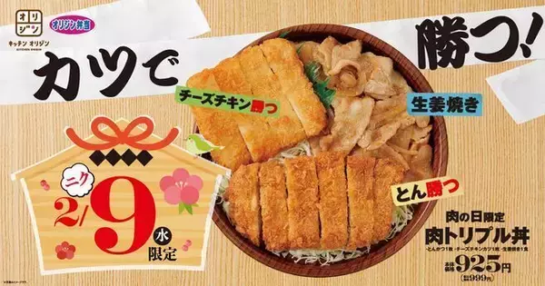 「オリジン弁当「肉トリプル丼」2月9日“肉の日”限定発売、とんかつ&チーズチキンカツと生姜焼き、“カツで勝つ!”」の画像
