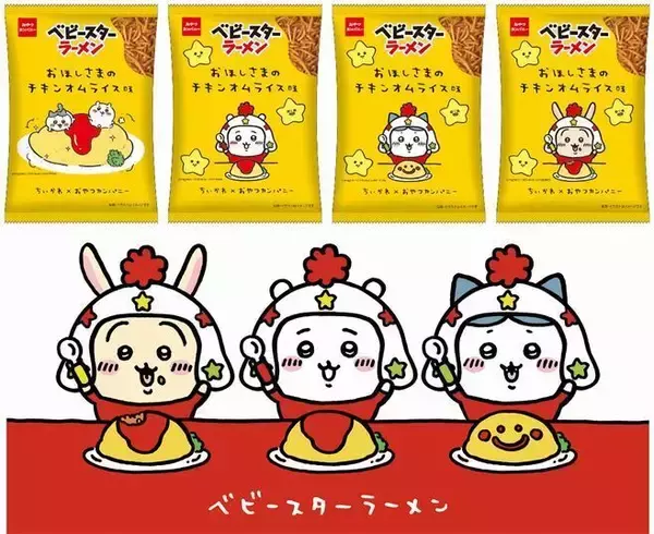 今回発売する「ベビースターラーメン(おほしさまのチキンオムライス味)」は、“ちいかわ”たちが、作品に登場するキャラクター“星”を助けたお礼としてもらった“でっかいオムライス”をイメージした商品。「たまごの甘みとチキンライスの風味が絶妙にマッチした味わい」に仕上げているという。