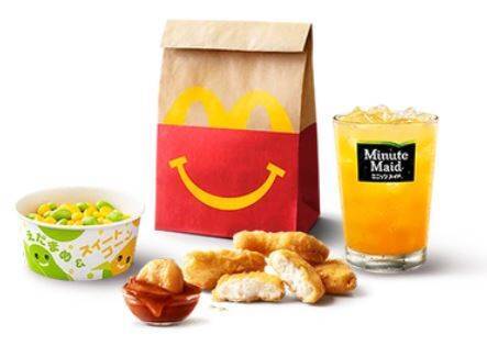 「ハッピーセット」はチーズバーガーやチキンマックナゲットなどのメインメニューに、サイドメニューとドリンク(S)、おもちゃまたは本が付くセット。