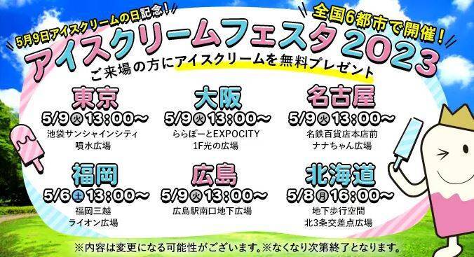 5月9日アイスクリームの日を記念し、東京・大阪・名古屋・福岡・札幌・広島の全国6都市で「アイスクリームフェスタ2023」が開催される。
