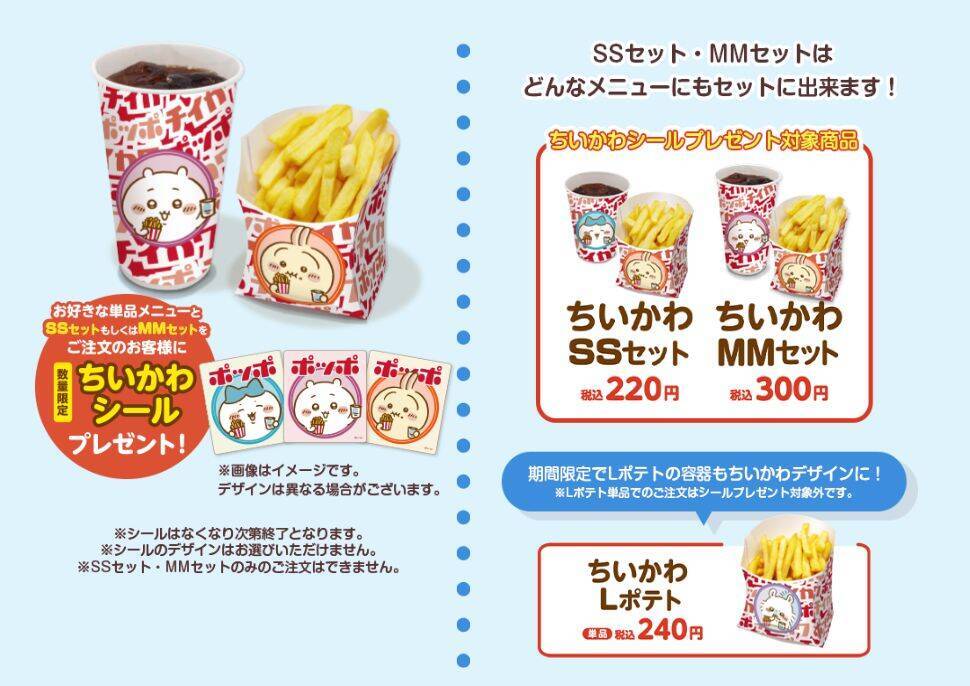 イトーヨーカドー内にあるファストフードショップ「ポッポ」では7月15日から、ポテト・ドリンクをちいかわデザインの容器にした「ちいかわSSセット(ポテトS・ドリンクS/税込220円)」「ちいかわMMセット(ポテトM・ドリンクM/税込300円)」を販売する。各セットは、好きなメニューを注文する際にセット商品として購入できる。セットを注文した人には、ちいかわシールをプレゼントする。シールは全3種類で、絵柄は選べない。ちいかわデザイン容器と特典シールは共に数量限定で、なくなり次第提供を終了する。