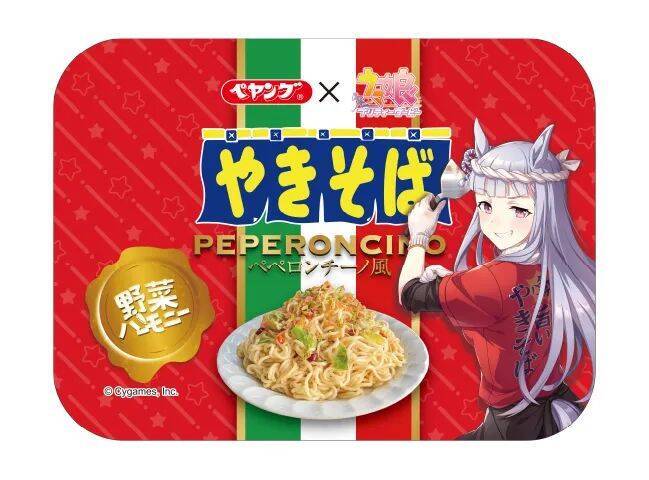 ゲーム作中でも焼きそばを作っているウマ娘「ゴールドシップ」をモチーフとした、ペヤングとのコラボ商品。3種類の色鮮やかな野菜フレークをかけることで、個性豊かなキャラクターが颯爽と駆け抜ける様子をイメージして仕上げている。