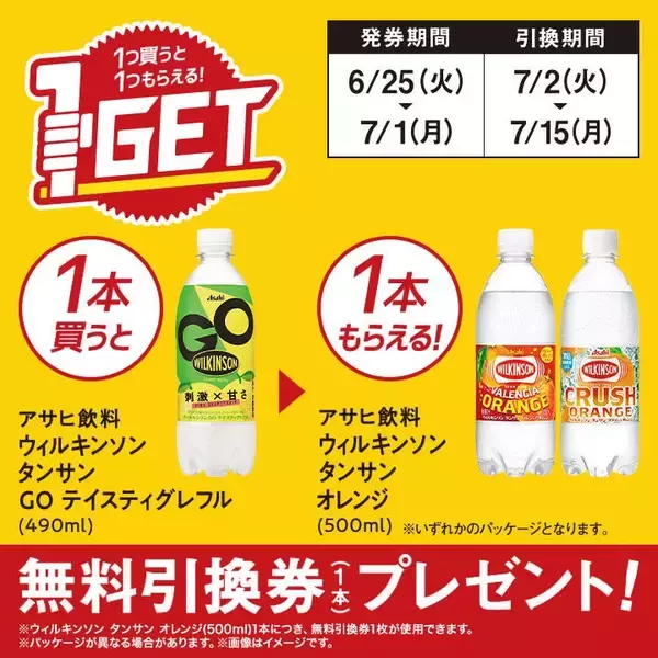 ミニストップ 「アサヒ飲料 ウィルキンソン タンサン GO テイスティグレフル(490ml)」購入で「アサヒ飲料 ウィルキンソン タンサン オレンジ(500ml)無料券」