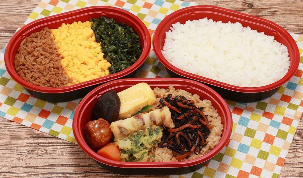 2位「3色ご飯」は、野沢菜漬、たまごそぼろ、鶏そぼろを盛り付けた弁当。