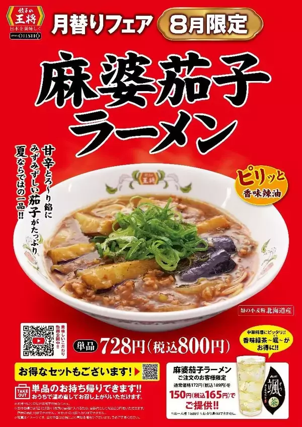 王将フードサービスは8月1日、「麻婆茄子ラーメン」を発売する。