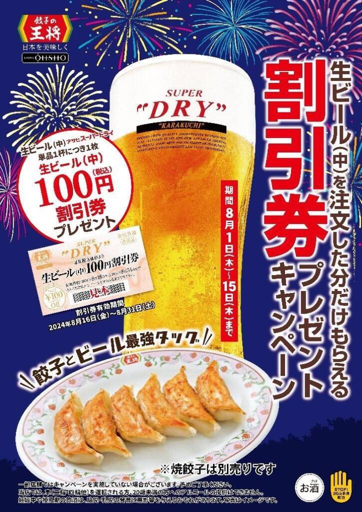 「餃子の王将」「GYOZA OHSHO」では8月1日から8月15日まで、「生ビール(中)割引券プレゼントキャンペーン」を開催する。一部を除く全国の店舗で、「生ビール(中)[スーパードライ]」を注文した分だけ、「生ビール(中)税込100円割引券」をプレゼントする。割引券の有効期間は、8月16日から8月31日まで。