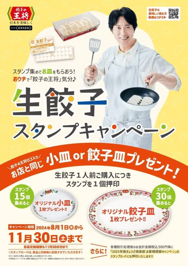 なお、「餃子の王将」「GYOZA OHSHO」では、8月1日から11月30日まで「生餃子スタンプキャンペーン」の開催も行う。“お持ち帰り生餃子”購入で貯まるスタンプ数に応じ、「オリジナル小皿」(スタンプ15個)、「オリジナル餃子皿」(スタンプ30個)をプレゼントするキャンペーン。