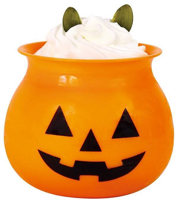ジャック・オ・ランタンのカップに入ったスイーツ。かぼちゃプリンに、シャンテリークリームを絞り、かぼちゃの種をトッピングした。ほろ苦い味わいのカラメルソースと、かぼちゃプリンは相性抜群だという。カップは食べた後に小物入れとしても使える。