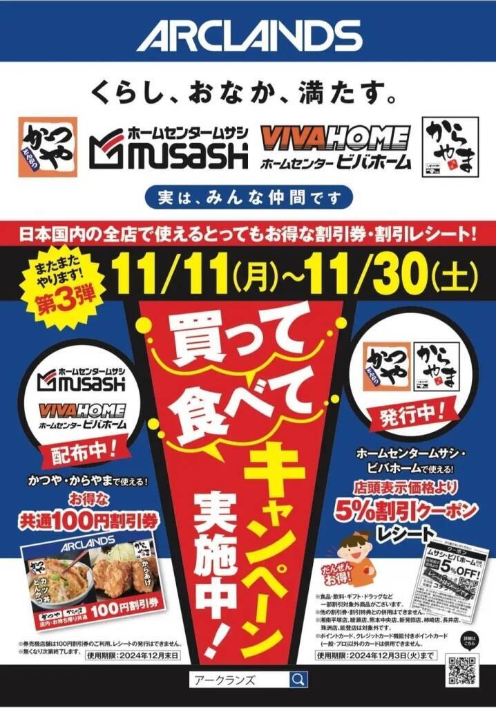 また、アークランドホールディングスのグループ会社で、「ホームセンタームサシ」「ビバホーム」などを運営するアークランズと、とんかつ専門店「かつや」、からあげ定食専門店「からやま」は「買って 食べて キャンペーン」を11月11日から11月30日まで開催する。