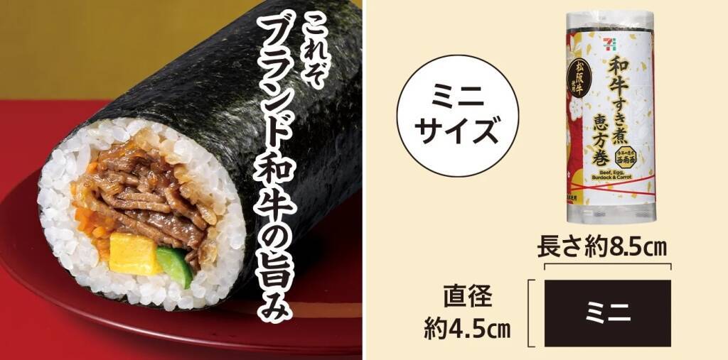「和牛すき煮 恵方巻」896.40円。販売地域により、使用するブランド牛が異なる。価格はいずれも同じ。サイズは約直径4.5cm、長さ8.5cm。具材は「ブランド和牛すき煮」「しらたき煮」「胡瓜」「厚焼き玉子」「人参とごぼうのきんぴら」。