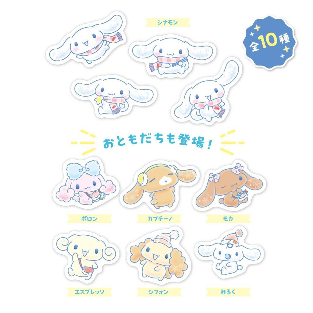 人気の“サーモン”と“ねぎまぐろ”を盛り合わせたメニュー。特典のコラボ限定ピックは全10種類(ランダム)。シナモンと、そのおともだちの「ポロン」「カプチーノ」「モカ」「エスプレッソ」「シフォン」「みるく」をラインナップする。裏面には「シナモンひとことメモ」を記載している。