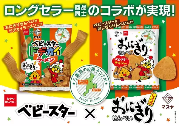 株式会社おやつカンパニー(三重県津市)と株式会社マスヤ(三重県伊勢市)は、各社の代表商品「ベビースター」と「おにぎりせんべい」の相互コラボを実施する。