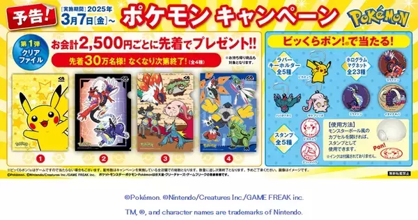 先着プレゼントは第1弾から第3弾まで展開する。内容と配布スケジュールは、第1弾「ポケモンクリアファイル」が3月7日から、第2弾「ポケモンアクリルスタンド」が3月19日から、第3弾「ポケモンマルチシート」が4月4日から。第1弾~第3弾それぞれ、デザインは4種類。