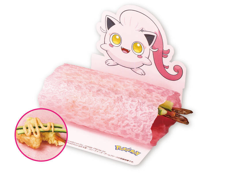 こだいのパラドックスポケモン「サケブシッポ」のカラーをピンク色のクレープ生地で、くるんとしたかわいらしい髪の毛をえび天で表現したメニュー。明太マヨやきゅうり、揚げシャリを包んでおり、さまざまな食感を楽しめる。