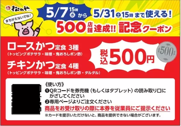 松屋フーズが展開するとんかつ専門店「松のや」は4月16日午後3時から、全国の店舗で『500店舗達成記念クーポン』を配布する。クーポンを利用すると、通常770円~の対象メニュー7品が、特別価格の税込50...