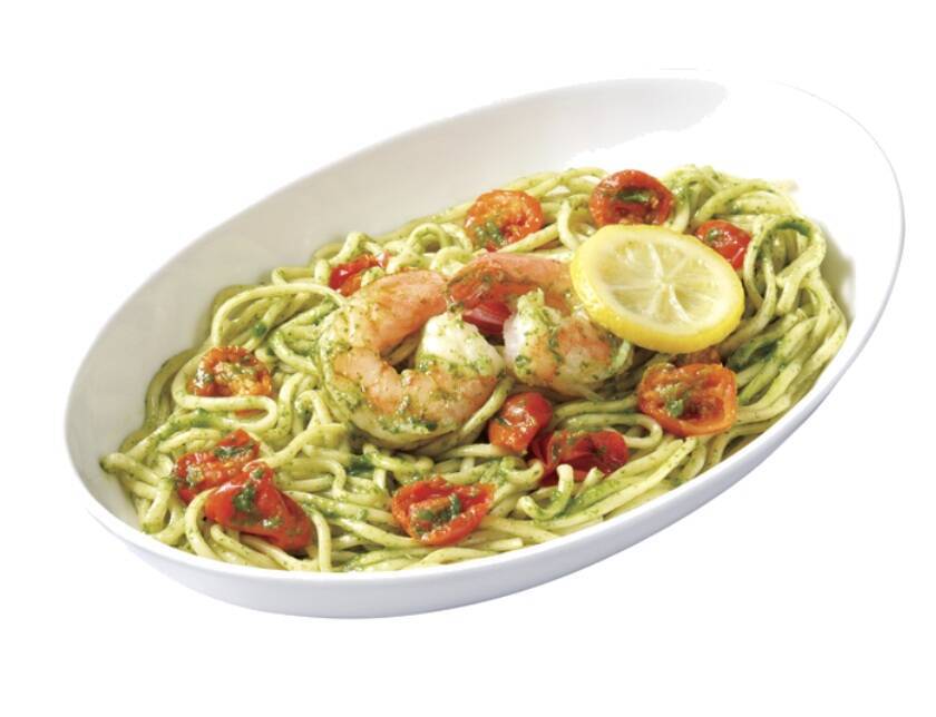 イタリアンスイートバジル100%となたね油、塩、水で仕立てた、本気(ガチ)バジル感を味わえる高級感のある新作パスタ。見た目にも華やかな大海老をトッピングし、バジルと相性のよいセミドライトマトを和えて風味豊かに仕上げた。皮ごと食べられるスライスレモンでさっぱり感も楽しめる。香料・着色料は使っていない。