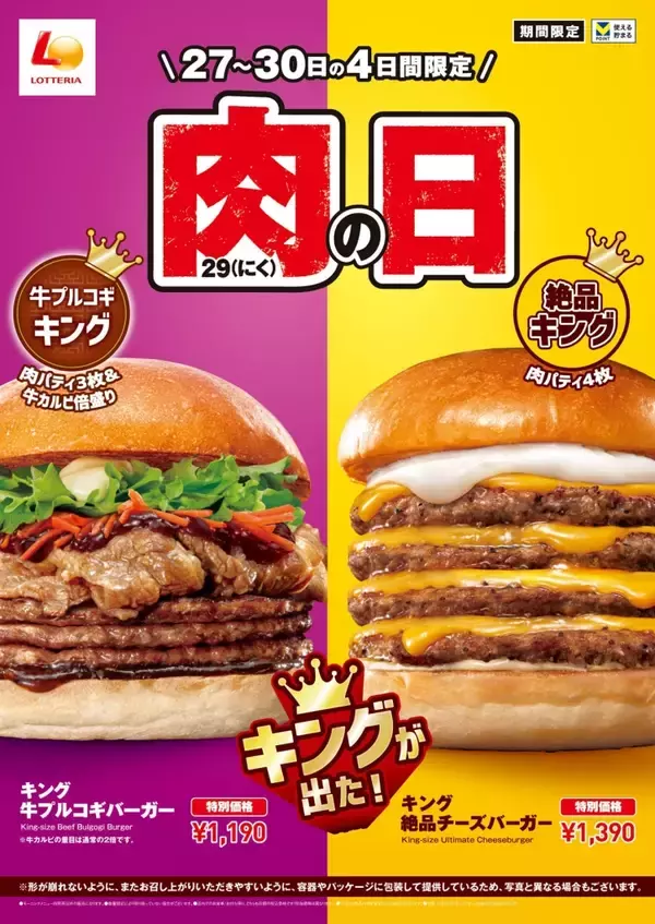 「ロッテリア「ロッテリア 肉(29)の日」6月27日から30日まで開催/肉パティ3枚&牛カルビ倍盛りの「キング 牛プルコギバーガー」と肉パティ4枚の「キング 絶品チーズバーガー」」の画像