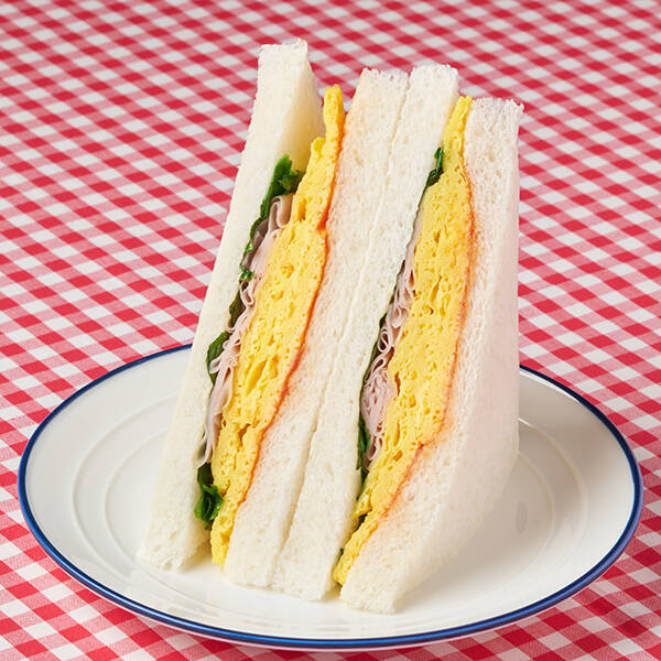 8月5日(火)発売。ふんわりとした食感の玉子焼を3枚重ね、ハム、グリーンリーフ、トマトのソース、マヨネーズと合わせて挟んだ。