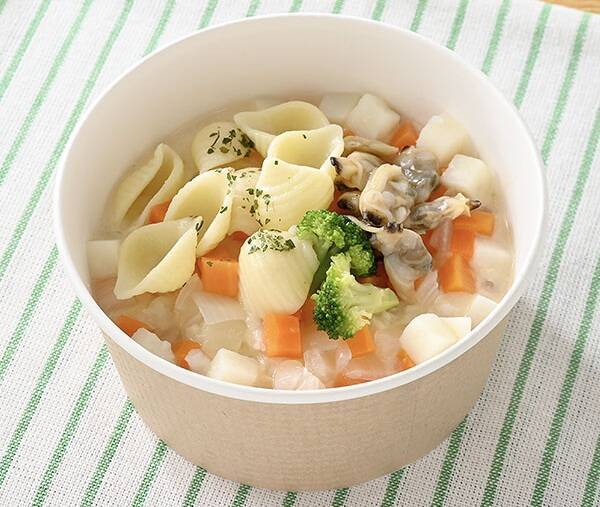 濃厚なあさりの旨みやクリームのコク、野菜の風味が特徴のクラムチャウダー。具材には、あさり、じゃがいも、野菜、シェルマカロニを使い、ボリューム満点に仕上げた。