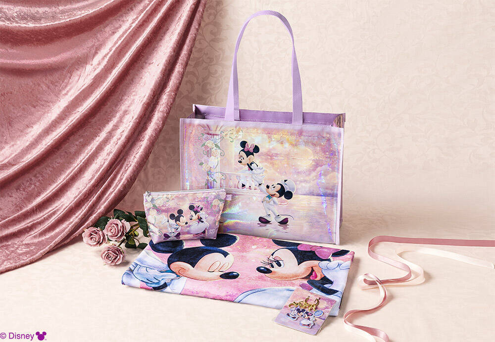 スペシャル缶とお揃いのデザインのオリジナルポーチ。裏面には「ミッキーマウス」と「ミニーマウス」のサインをデザインしている。