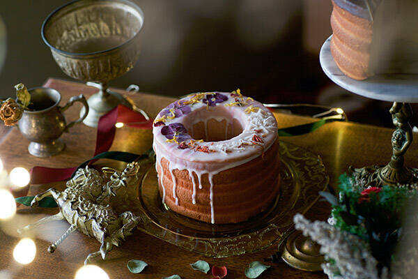 「お花のいちごバウム」は、いちご味のバウムにやさしいピンクのチョコレートとパープルのビオラの花、そしてラベンダーが香るガーリーな一品。