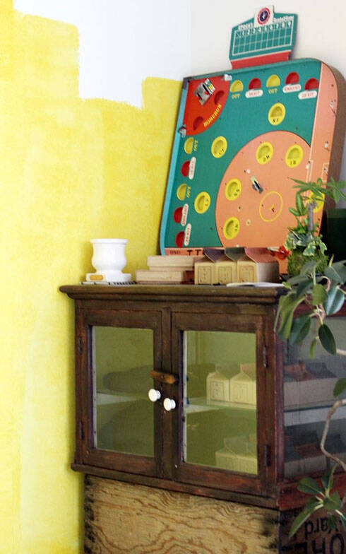 戸棚は近所のビンテージ家具を売っている店で、レトロな野球盤はのみの市で購入した(写真撮影/SUUMOジャーナル編集部)