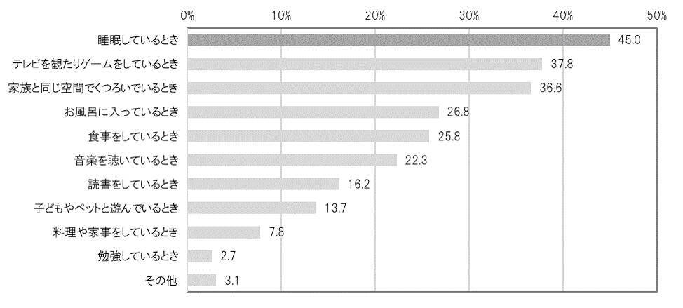 「家にいるときに、どのようなシチュエーションが安心・リラックスできるか」を聞くと、半数近い45%の人が「睡眠しているとき」と回答した。