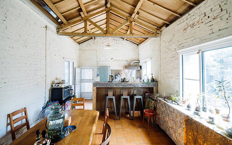 窓がたくさんのキッチン。キッチン設備も古い家からもらってきたものだそうで、使いやすく整えられていました(写真撮影/KRIS KANG)