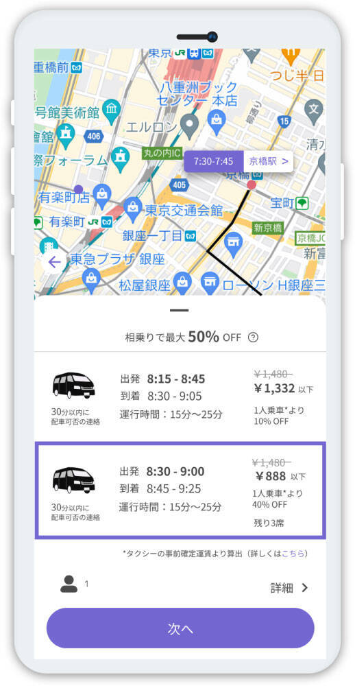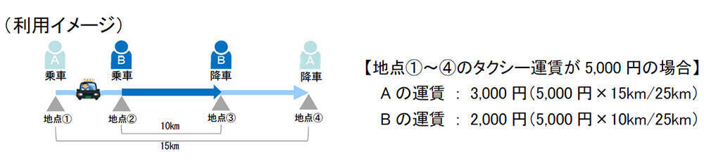 原則として乗車距離に応じて利用者ごとに料金が案分される(下図参照)。そのため利用者としては割安にタクシーを利用できる。これまでタクシーの相乗りといえば、多くは同じ方面を利用する知り合い同士での利用に限られていたうえ、先に降りる人が最後まで乗る人に「なんとなく案分」して支払っていたが、このサービスを利用すれば明朗会計できるというわけだ。