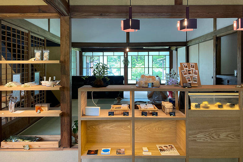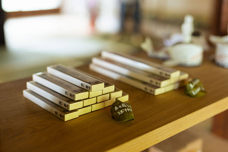年月を経た家の重厚な空気感に、ラインの美しいカウンターや洗練された椅子とテーブル。ショーケースには美味しそうなケーキが並び、レジ向こうは座敷になっていて、女性スタッフが座って花火づくりの作業をしていた。