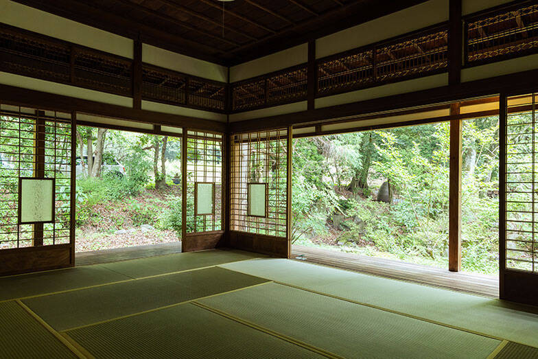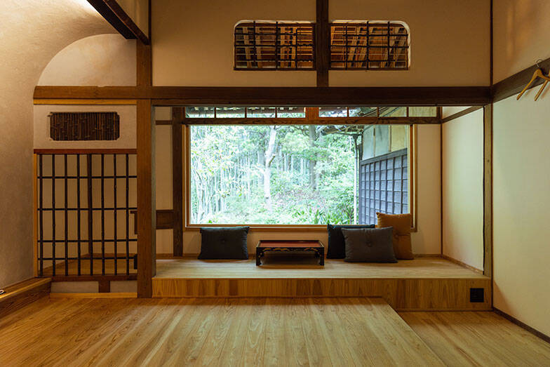 年内には宿「山の家」もオープンする予定。全面に庭の緑が見える広々としたお座敷と、現代風にアレンジされた中の間の二部屋、屋敷の右半分が貸切で使用できる。