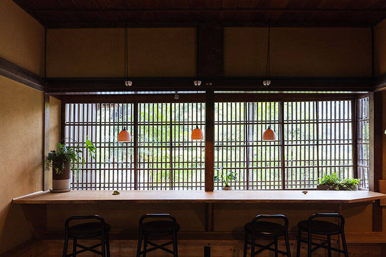 古い壁から出てきた竹格子はあえて残してある。窓際のカウンター上部には長崎の陶器ブランド「JICON」のオレンジ色の照明が存在感を放っている。(写真撮影/藤本幸一郎)