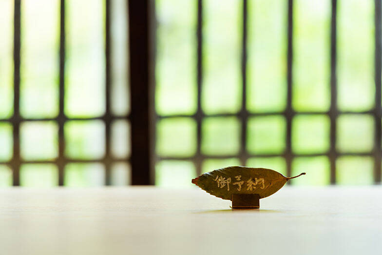 「カフェフイユ」のフイユとはフランス語で「葉っぱ」のこと。「葉っぱに「予約席」の文字(写真撮影/藤本幸一郎)