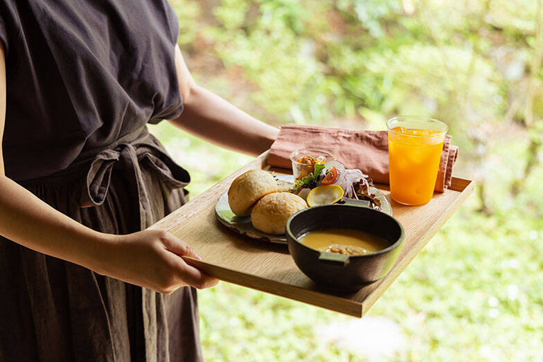 山の家を始めるうえで協力してくれた人たちは数えきれない。今日子さんの話に登場する人たちはみんな、個性的で魅力的で聞いていて飽きない。ジビエ料理にしたのも、ハンティングから手がける若きシェフとの出会いがあったから。カフェの器を依頼したのは海外に暮らす作家さん。びわの栽培を教えてくれた佐賀のおじいさんの話。