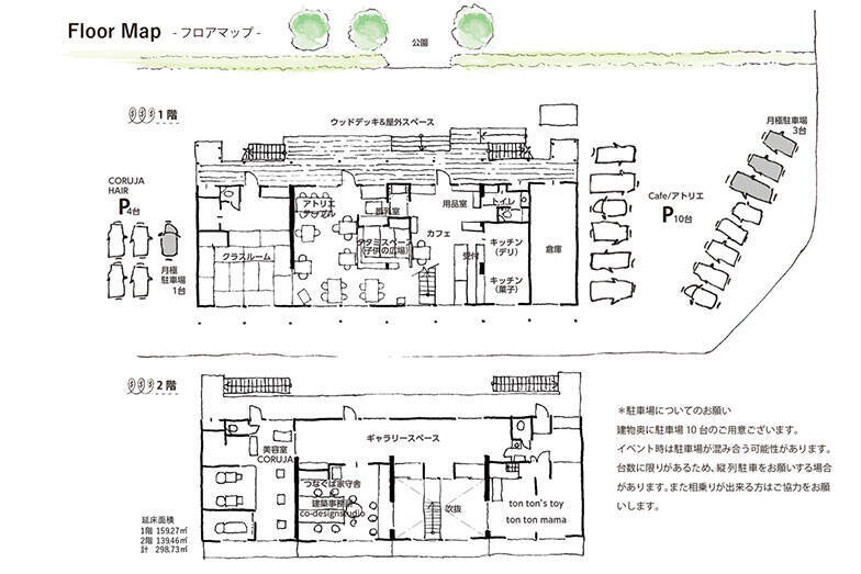 ――今では1階にカフェスペースをはじめ、アトリエテーブル、クラスルーム、ウッドデッキ、2階にギャラリーワークスペース、託児所「ton ton’s toy」、美容室「コルジャヘアー spa&nail」、建築事務所「co-designstudio」と、さまざまな機能を持っていますね。