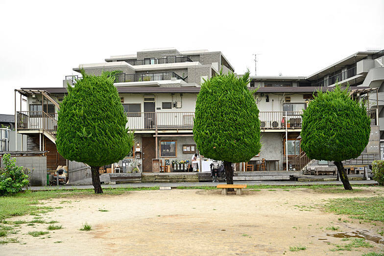 「シェアアトリエ つなぐば」の前の八幡西公園に植えられた3本の木(写真撮影/松倉広治)