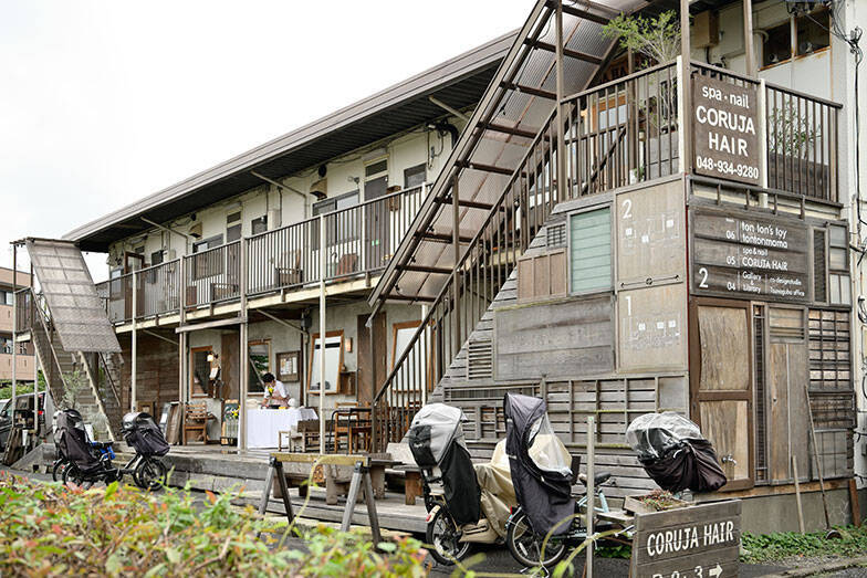 埼玉県草加市の住宅街にある「シェアアトリエつなぐば」。築35年の鉄骨2階建てアパートをリノベーションした施設内には、子連れでも働けるシェアアトリエやコワーキングスペースとしても開放しているギャラリーワークスペースのほか、カフェ、託児所、美容室などが入居し、地域ににぎわいを生んでいる。