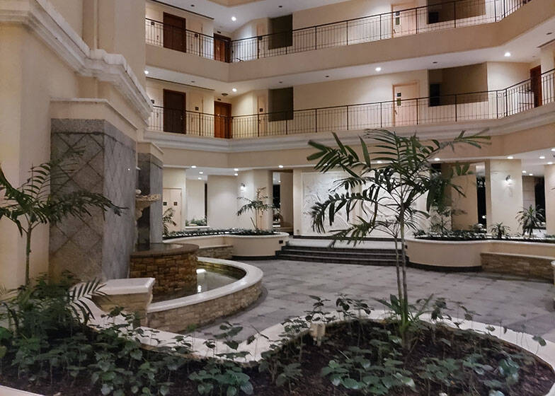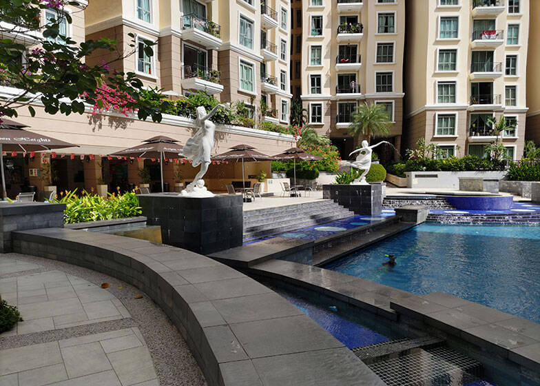 コンドミニアムの中庭。噴水があるなどリゾートホテルのような雰囲気だ(写真撮影/四宮朱美)