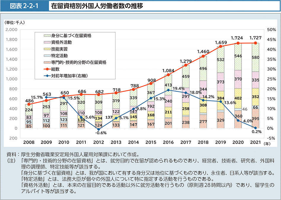 日本における外国人労働者は、ここ10年余りで大幅に増え、今後も増加の見込み(資料引用元/厚生労働白書2022年度(令和4年度))