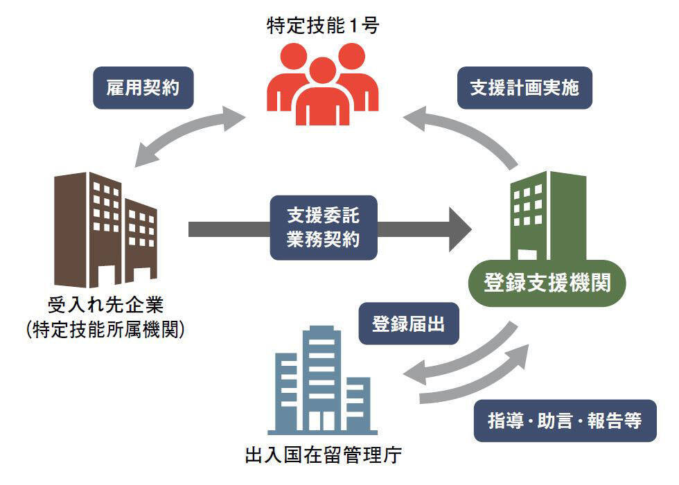 登録支援機関とは、特定の産業分野で経験や知識を有していると認められた特定技能外国人が日本で就労する際に、安定した暮らしを送れるよう支援する機関。就労の受け入れ先である雇い主から依頼を受けて特定技能外国人のサポートを行います。