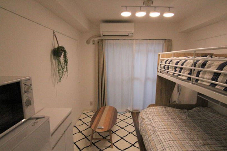 After 家賃10万円/月 二段ベッドおよび、家具家電を備え付けにし2人入居可能にしたことで入居者にとっては割安な部屋となりオーナーにとっては賃料アップが見込めるようになった。短期・中期・長期と契約期間に応じたプランを設け、外国人がより入居しやすいような仕組みにしている(画像提供/日本エイジェント)