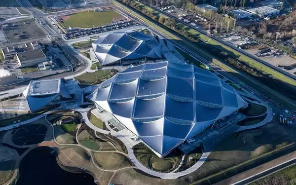 上空から俯瞰(ふかん)すると、巨大な親子の亀が並んでいるかのようだ。銀色の甲羅に見える特徴的なデザインの屋根の上には、計約5万枚の太陽光パネルが設置されている。この枚数からもイメージできるとおり「グーグル・ベイ・ビュー・キャンパス」のスケールは圧倒的に大きい。社屋はNASAエイムズ研究センターに隣接する42エーカー(約17万平米)の敷地に広がっており、総面積は110万フィート(約10.2万平米)。東京ドーム2個がすっぽり収まる大きさだ。その中に、20エーカー(約8万平米)のオープンスペース、2棟のオフィスビル、約1000人収容できるイベントセンター、240戸の短期従業員用宿泊施設などがある。