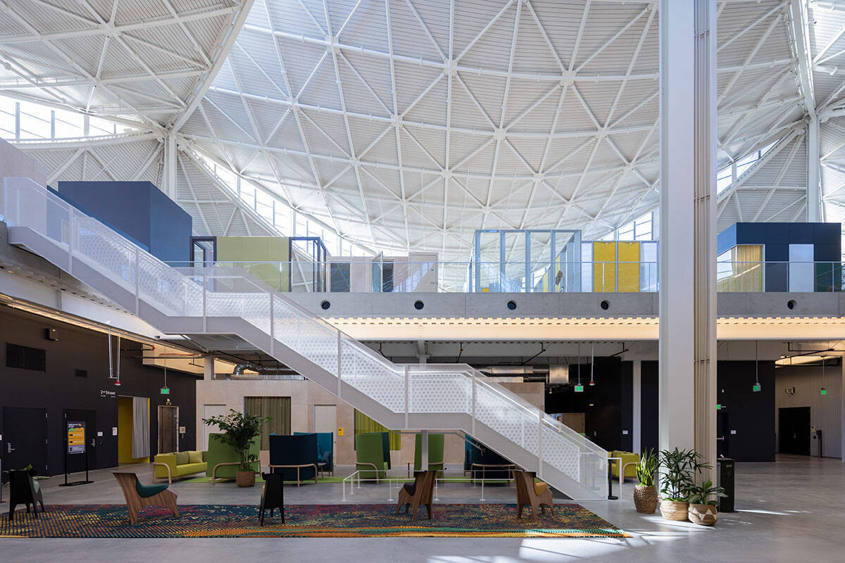 公式リリースによれば、総面積はサンフランシスコで最も高いオフィスタワーと同じ。タワーオフィスであれば幾重にも積み重ねられるフロアプレートを上下2層とし、活気あるコミュニティを形成しているとのこと。確かにフロアが多数に分かれているよりもコミュニケーションははるかに取りやすく、クリエイティブワークをするには適切な環境だろう。
