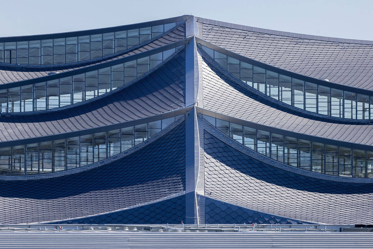 屋根のクローズアップ。“龍の鱗”とも称される太陽光パネルが敷き詰められている。中央の棟(むね)の左右に弓形の開口部が連続するデザインで、建物内には自然光が降り注ぐ(c)Iwan Baan