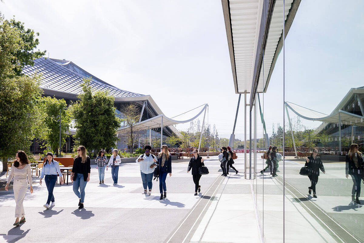 グーグル・ベイ・ビュー・キャンパス敷地内に広がる約8万平米のオープンスペースを闊歩するグーグルの社員たち。キャンパスといえば「大学」を連想するが、近年は企業が建てる「コーポレート・キャンパス」がトレンドに。広大な敷地にオフィスだけでなく、社員のプライベートや交流をサポートするさまざまな施設を内包した、まるで大学キャンパスのような空間である(c)Iwan Baan